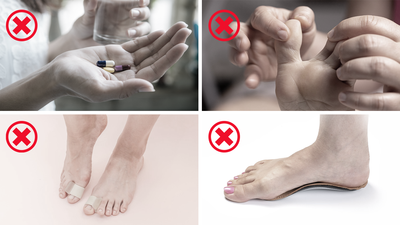 ❌ Bunion pedleri ve parmak aralığı - Sadece ağrıyı maskele, parmağınızı pozisyonundan çıkaran baskın kasları yeniden eğitmek mümkün değil